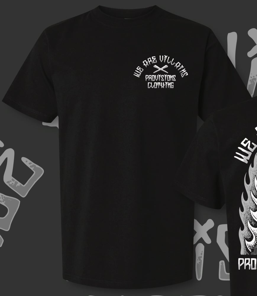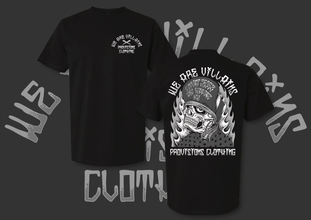 WE ARE VILLAINS X PROVISIONS CLOTHING COLLAB TEE. Limited availability. Black heavy weight streetwear tees.